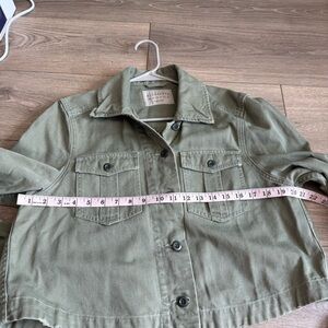 Chic khaki utility jacket with button front. Features dual chest pockets. Ideal for casual wear. EUC All Saints Maisy Green Denim Jacket. Slightly distressed hem, boxy fit.