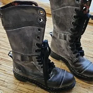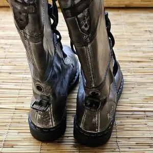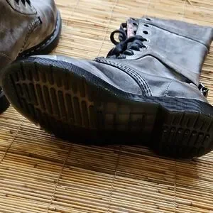 Rugged and stylish combat boots. Distressed gray leather. Lace-up design with sturdy sole.