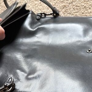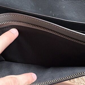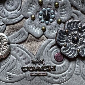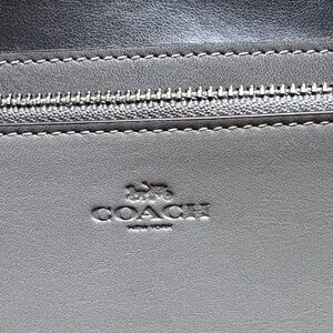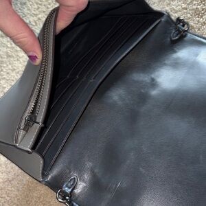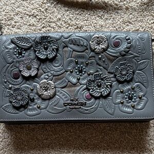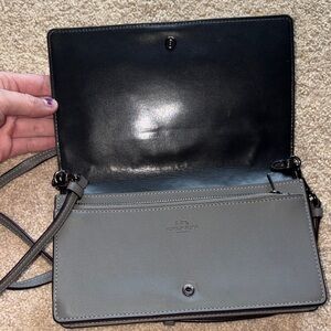 Coach Foldover Crossbody Clutch with Metal Tea Rose Tooling, style number 24958, in grey leather. In very good condition, the suede on the front could use cleaned but besides that in almost perfect condition super cute coach bag!
