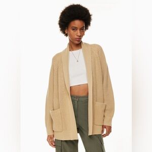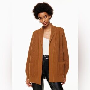 I usually wear size XS and this fits me well. “This is a relaxed fit shawl cardigan with raglan sleeves, patch pockets and fully fashioned constitution. It’s made with embrace merino - extra fine 100% merino wool yarn covered for its natural warmth and super soft feel. We source ours from a premium Italian mill. This version is constructed using a half cardigan stitch with vertical ribs for a textured look and feel”