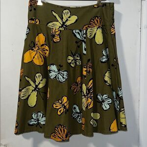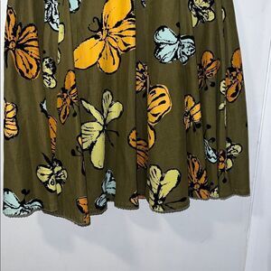 Olive green micro corduroy A Line skirt with yellow, orange, light blue and black butterfly print throughout, hidden zipper on the side seam, washable or dry clean, fully lined. Excellent condition. Size 8, measures 16” across waistband, 4” wide waistband and 24” from top to bottom.