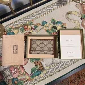Gucci x Supreme Card Holder. Light use, all slots are in perfect condition, stitching and pattern in tact, item comes with original bag, box, and paraphernalia. It also says 'men's' but anyone can use this! It's the perfect size and such a beautiful perfect.