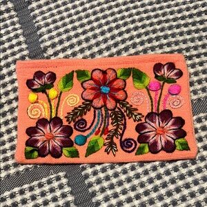 This vibrant embroidered clutch features a stunning floral design. Perfect for adding a pop of color to any outfit. Never used. 8.5” long, 5.5” high. Purchased in Peru.