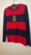 Bold red and dark blue stripes. Embroidered crest on front. Classic long sleeve design. Has some tiny stains on the dark part (pictured) barely noticeably without flash light on it.