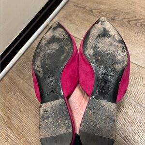 Elegant fuchsia suede mules with a pointed toe. Features a bold metallic accent for a modern touch. Has wear