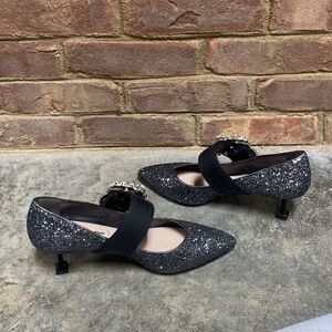 Miu Miu Glitter Jeweled Buckle Pointed Toe Pump Size 37.5