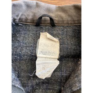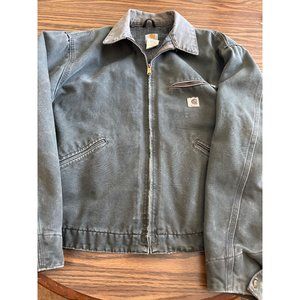 Carhartt Detroit gray green zip front coat jacket size XL. Has three pockets in front and one deep pocket inside left. Plaid fabric interior. Has a few holes on right sleeve, and some threads showing at ends of sleeves, otherwise good pre-owned condition. Vintage March 2003.