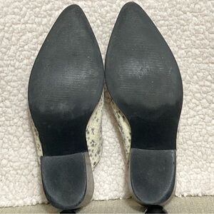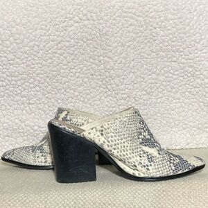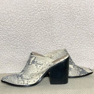 Steve Madden Women's Savina Leather Snakeprint Block Heel Mule Slip On Shoes. Color: Snakeprint (Black/Grey & Cream). Pre-owned Condition - refer to pictures for description of shoes. Note there is signs of wear on the insole of one of the shoes but should not affect performance of shoe - refer to picture. No Rips or Tears. Smoke-Free.