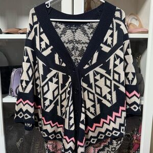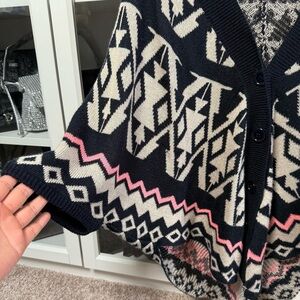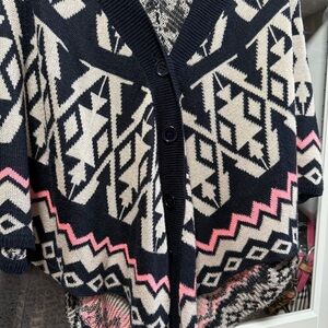 Rhapsody Colorful Blue and Beige Geometric Cardigan Sweater Poncho Size Medium