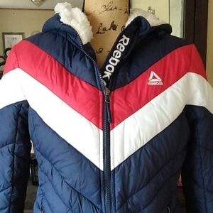 Reebok Sherpa Fur Hood Quilted Puffer Jacket - Chevron Red White & Navy Blue