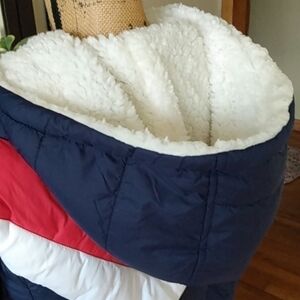 Like-new Reebok puffer jacket in navy with bold red and white color blocking. Features a cozy Sherpa-lined adjustable hood, full front zip closure, and zippered side pockets. Logo accents on the chest and inside zipper area. Warm, soft, and lightweight — perfect for chilly days or après-ski style.