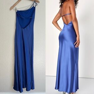 Flirtatious Evenings Blue Satin Asymmetrical Backless Maxi Dress