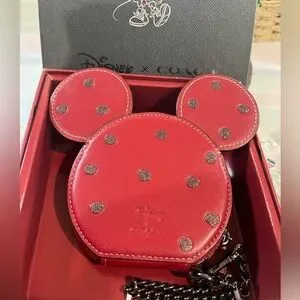 Charming Coach coin bag with Minnie Mouse design. Bright red with playful polka dots. Ideal small items. Secure zip closure.