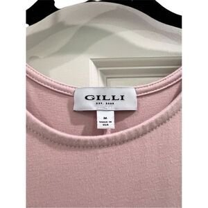 Keywords: Gilli dress, pink dress, knee-length, spring fashion, women's clothing, round neck, short sleeve, ruched detail, pullover dress, hand washable, pre-owned, casual dress, made in USA, comfortable fit, business casual, work dress