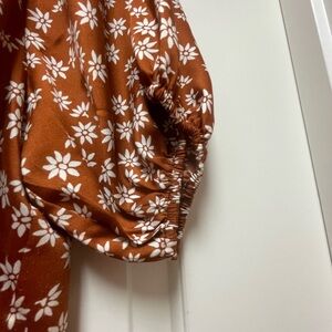 Charming rust colored blouse with white floral design. Features puff sleeves and a relaxed fit. Ideal for casual outings.