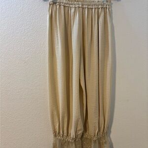 Relaxed bloomer pants with elastic waistband, drawstring tie, and scalloped lace trim at hem in Ecru. New with tags on original packaging.
