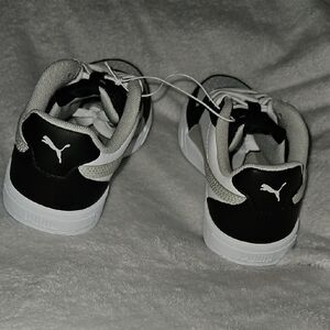 These Puma sneakers boast a bold black and white color scheme, featuring a low-top silhouette with a chunky, athletic design. The shoes are equipped with a padded collar for added comfort and support, making them perfect for casual athletic wear.