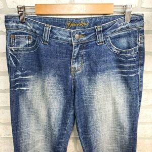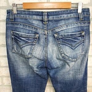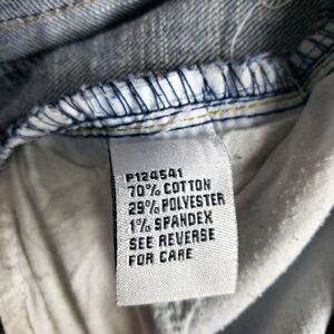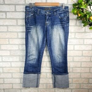 The cropped capris have a high cuffed bottom hem and great faded design with stretch material. The pants have 3 front pockets, belt loops and a button and zipper closure, there are also 2 back pockets as well. Would look amazing with a pair of wedges or heels! Excellent condition, no holes or rips.