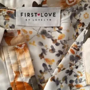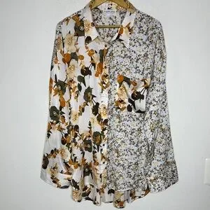 New blouse. This mixed floral print First Love blouse feature a folded down collar, buttons along the front, a chest pocket, long sleeves with an optional button at the cuffs, and a high low hemline. Lightweight, satin material that is non sheer. Model is wearing the small and these have an intended relaxed fit. We suggest looking at measurements to get the best size for you.