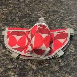 Features red and burgundy abstract design with gray trim. Attaches to stroller via Velcro. Stores drinks and other small items for easy access while pushing your child(ren). Convenient and portable, and in excellent condition, i.e., no rips, stains or other damage!