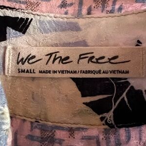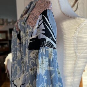 Beautiful blue hues & pink. Over sized blouse. Gathered fabric on shoulder sleeve, the front and back of blouse. Notice very small tear on side seam, easy stitch. Lovely