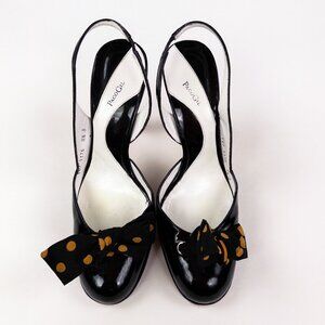 Paco Gil Platform Patent Leather D'Orsay Pumps Heels. Made in Italy. Round toe with black and gold polka dot bow. Small platform. Sling back with classic D'Orsay design.