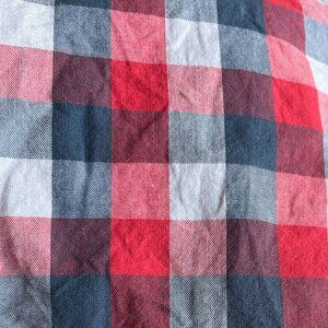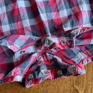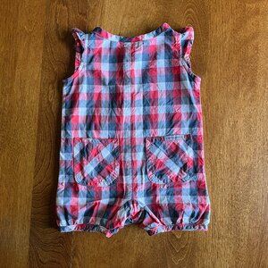 Carhartt lightweight summer romper in red and navy blue picnic plaid, baby size 6 months. Sweet details like flutter cap sleeves, henley-style buttons up the front, slightly puffed legs, and diagonal plaid pockets on the rear. Cute for Fourth of July and patriotic events, or everyday wear. VGUC; slight wash wear.