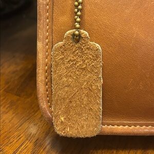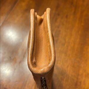 Coach vintage camel brown leather pouch zip top. The zipper runs very smoothly has the original leather hangtag. The bag overall is absolutely beautiful. It has normal where to the leather. The interior is striped. Has one mark on the backside is shown in the photo. Please look at all of them closely the pouch measures 7 1/2 x 4 1/4 by one and a half
