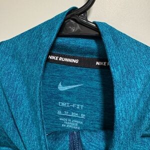 Elevate your activewear with this Nike teal sweatshirt. Features a 1/2 zip design and iconic logo. Ideal for workouts or casual outings.