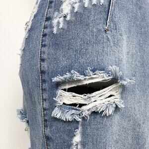 - Distressed medium wash denim fabric. 100% cotton. Back zipper and slit. Intentional holes and distressing.
