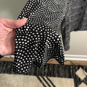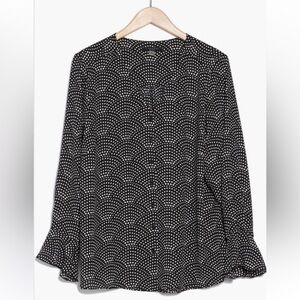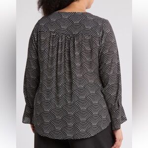 The T Tahari blouse features a striking black and white geometric print, offering a relaxed fit with a buttoned front. Crafted from lightweight fabric, it is perfect for both casual and business casual settings. The blouse's unique wave-like design adds a touch of elegance to any outfit.
