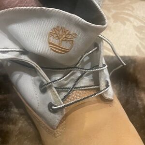 Classic Timberland boots with Light brown suede with white accents. Ideal for outdoor wear. I love these boots, even rode Harley with them on occasion, they look cool and OG for sure! Totally Bad to the bone