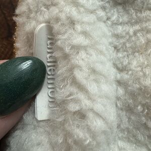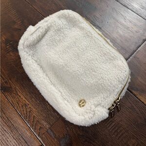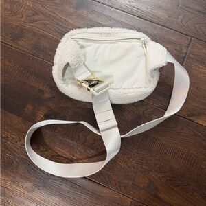 Elegant white ivory cream Sherpa crossbody belt bag with gold accents by lululemon athletica. Ideal for daily wear with a modern look. Excellent condition. Polyester nylon material. Outside is Sherpa. Larger size not mini.