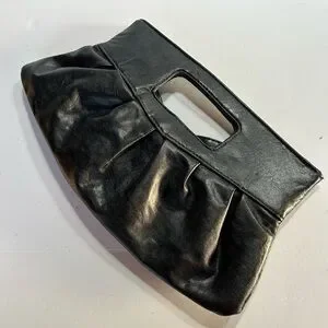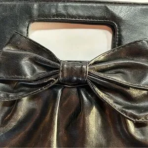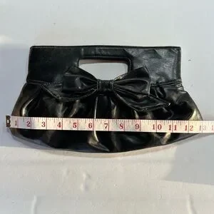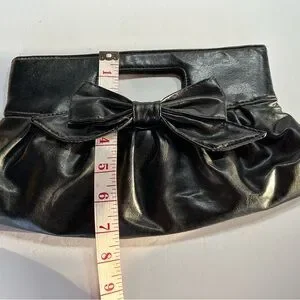 This chic black clutch features a stylish bow detail, perfect for any occasion. Its sleek design adds a touch of elegance to your ensemble. This unbranded designer look alike features a snap closure and an inside slip pocket. Please see photos for measurements. Preowned and in excellent condition.