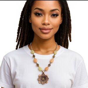 Vintage Necklace Copper Colored Flower w/ Beads On A Chain Bohemian Earthy