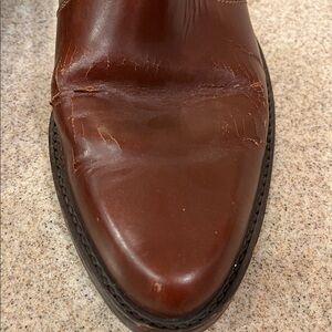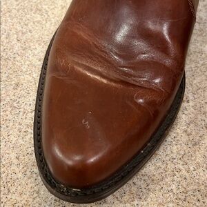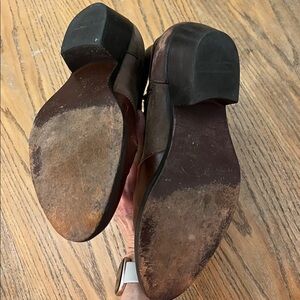Leather soles look great, heels look great for worn shoes. Right vamp shows creasing left vamp has cracking. Inner heels show minor wear. 1.5 “ heel height.