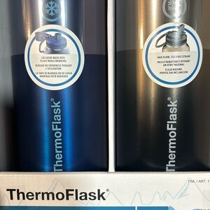 Set of two ThermoFlask insulated water bottles. Includes one blue and one gray bottle. Perfect for keeping drinks hot or cold.