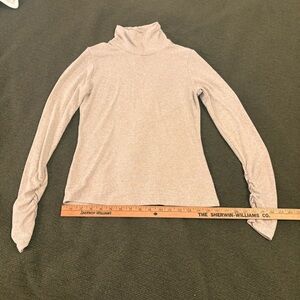 Comfortable lightweight turtleneck with elastic scrunch at the sleeves and back of neck.