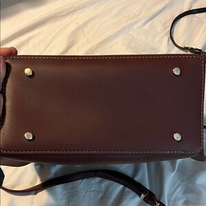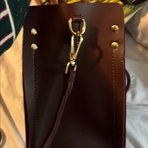 Chic burgundy tote by Laura Ashley. Features unique wooden handles. Perfect for stylish outings. Three inside compartments.