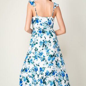 LUMIERE Blue Floral Ruffle Wrap Midi Dress, White Summer Wedding Guest Outfit