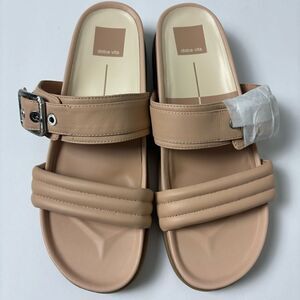 Genuine leather upper with silver buckle accent. Two straps. Slip on with contoured footbed. Rubber outsole. Very comfortable. Never worn.