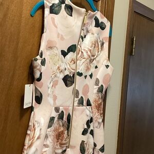Elegant midi dress with a floral pattern. Features a sleeveless design. Perfect for any occasion.