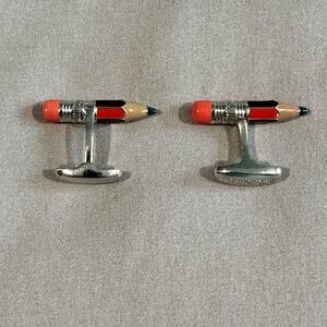 These cuff links feature a playful pencil design with a vibrant red body and a sleek silver tip, perfect for adding a creative flair to formal wear. Crafted with polished silver-toned metal, they secure elegantly to any shirt cuff, making them a unique accessory for any occasion.