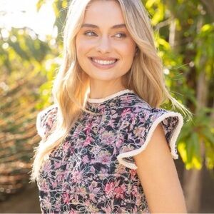 Voy Floral Embroidered Fringe Detail Back Ribbon Top. Unique and special floral embroidered woven fabric. Wish the fit was better on me! Features a semi-high round neckline with off white fringe details and a back ribbon tie closure. Size Large. Laying flat PTP ~21”. Length ~24”. Wore once and laundered.