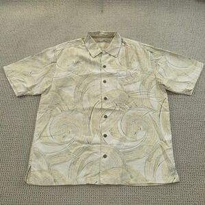 Keywords: Tommy Bahama shirt, silk shirt, button down shirt, short sleeve shirt, mens shirt, cream shirt, beige shirt, swirl pattern, resort wear, casual shirt, medium size, M size, silk top, summer shirt