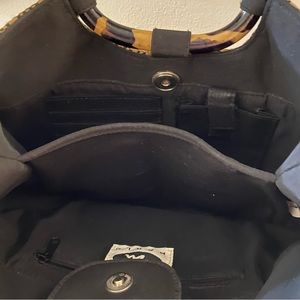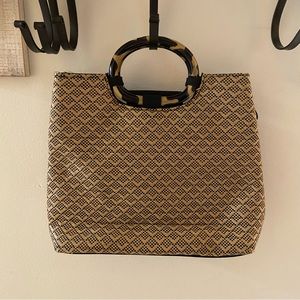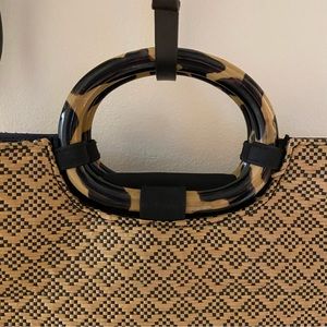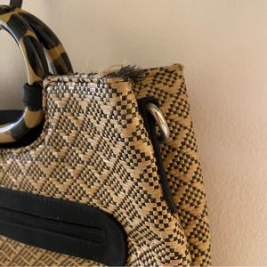 Vintage Marlo basketweave leopard handle satchel bag. Magnetic snap closure. A crossbody strap can be added, but is not included. Zippered outside pocket. Some light wear around the bottom. Approximately 13 inches wide and 10.5 inches tall.