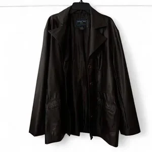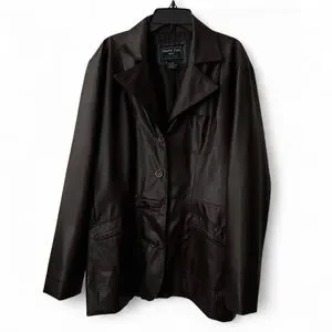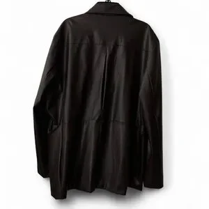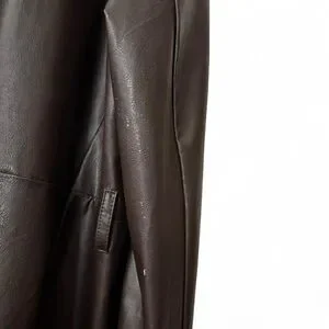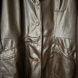 Vintage dark brown faux leather jacket with button-front closure. Features 2 front pockets. Missing one button and minor wear/staining (see last 3 photos) but overall fair and functional condition.