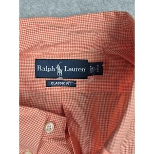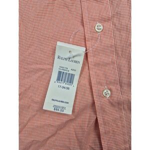 The product is a NWT Polo Ralph Lauren Men's Classic Fit Button-Down Shirt in size 17 34/35 with an orange check pattern. Made of cotton fabric, this shirt features long sleeves, a collared neckline, and a button-down style collar. The classic fit and preppy theme make it a versatile and stylish addition to any man's wardrobe. Perfect for casual or semi-formal occasions, this Ralph Lauren shirt is sure to elevate the look with its timeless design and quality construction.