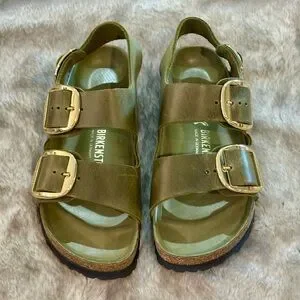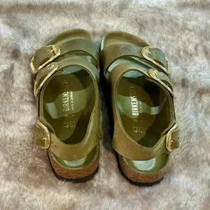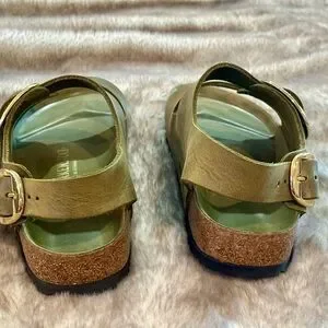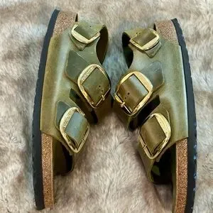 Comfortable green sandals with adjustable gold buckles. Ideal for long walks and the color is perfect for fall!