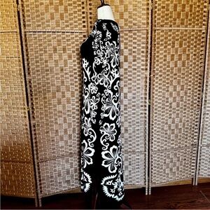 Just stunning! Would be gorgeous with hi Mary, Jane’s, boots or flats. Would love to see this with a tennis shoe and a hat. The material has stretch, is meant to be fitted and is so soft to touch. The floral pattern is gorgeous and it’s a true black with a cream print. Size extra large and brand new with tags. So versatile and great for a date night, girls, night out, work, professional, career, theater, vacation, or resort, winter strolls, or just anywhere you want to feel extremely comfortable while looking your best.